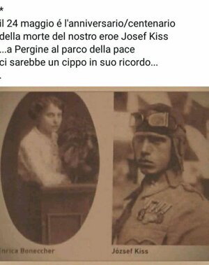 Alla morte di Enrica, in casa sua venne ritrovata l’uniforme di Jozsef Kiss, oggi custodita da Andrea Marighetti assieme a molti oggetti personali. Nel 1970, con una decisione quanto mai discutibile,il cimitero militare di Pergine Valsugana fu dismesso ed al suo posto venne realizzato un parco pubblico: lì si trova una lapide a ricordo del nostro eroe dei cieli.Magari, oggi, a cento anni dalla morte di Kiss, qualcuno passerà di lì a portare un fiore, in memoria di entrambi…